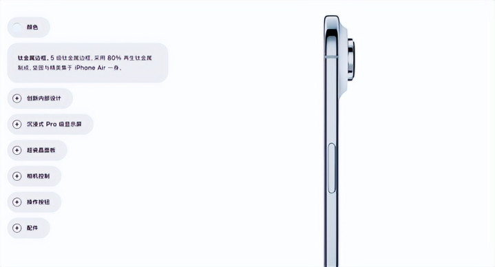 这也使得iPhone Air 成为苹果唯一一款采用钛金属框架的机型,而iPhone 17、17 Pro、17 Pro Max已经重新回归铝制框架。